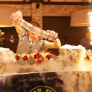 Кроме лазерных и фаер-шоу, особо актуальными на свадьбах стали также бармен-шоу с интерактивом – акробатикой, а также жонглированием бутылками и шейкерами. Такая программа также включает в себя приготовление необычных коктейлей, например в тон свадебной цветовой палитре и многое другое.